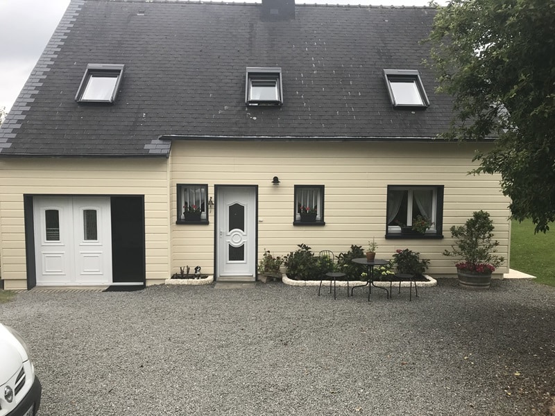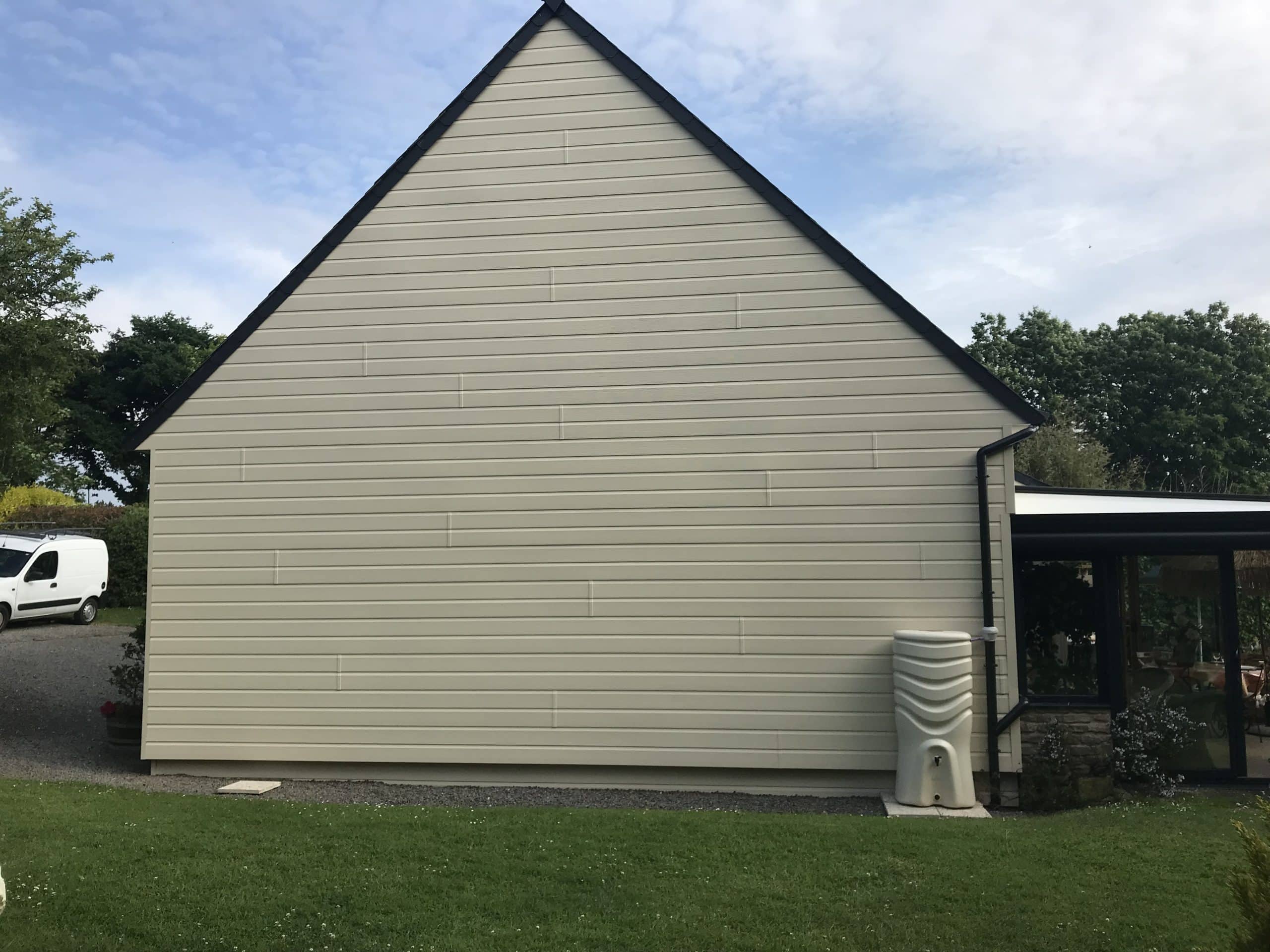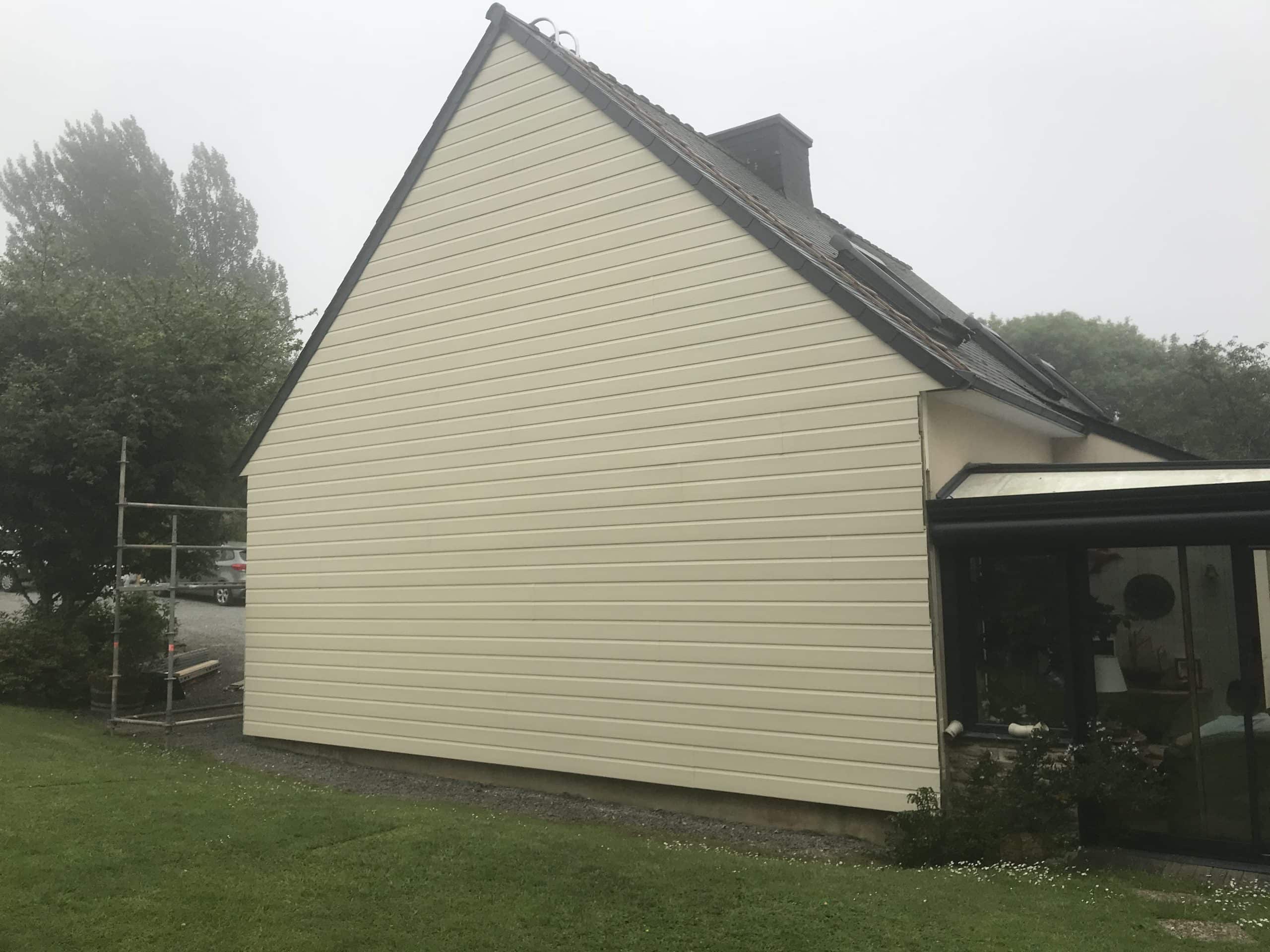 Ici, un exemple de bardage sur la totalité de la maison. Clin en PVC beige, débord de toiture réalisé pour palier à la surépaisseur du bardage et pour une finition plus soignée que de simples habillages en tôles aluminium.