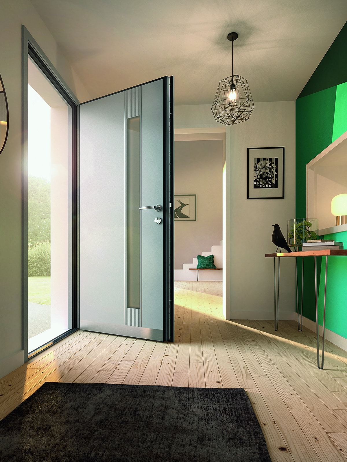 » Réalisations » Porte d’entrée contemporaine, avec une petite surface vitrée.