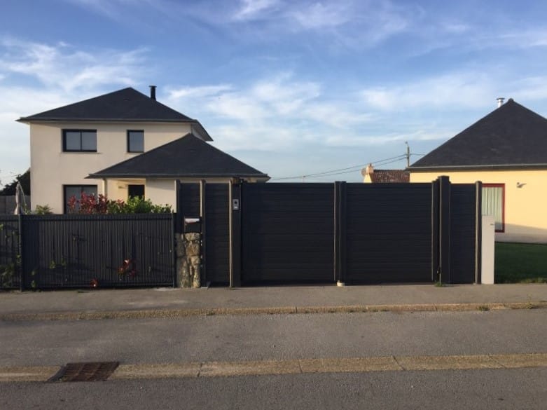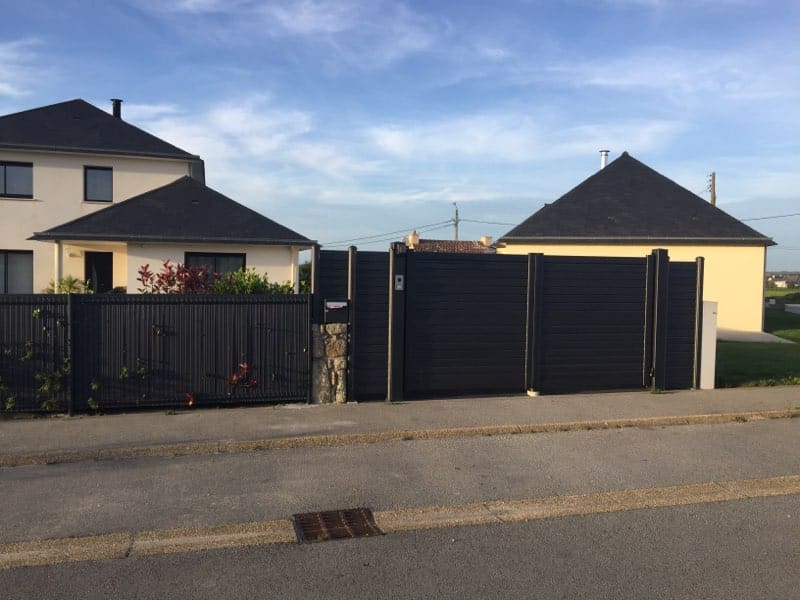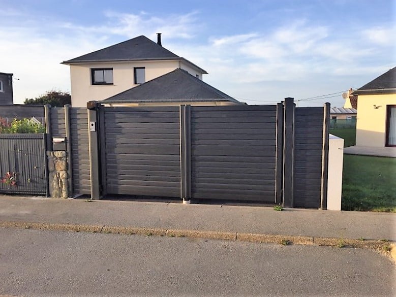 Ici, un ensemble assorti portail – clôture alu 2100 sablé. L’ensemble est en lames brises vent horizontales idéal dans notre secteur bien exposé au vent. Ouvrant à la Française, mais il existe comme tous nos modèles en coulissant également. C’est le modèle « Castellane » de chez Maine Clôtures qui est présenté ici.