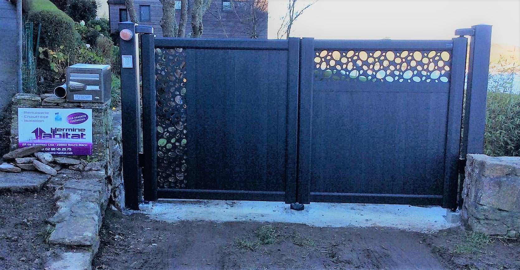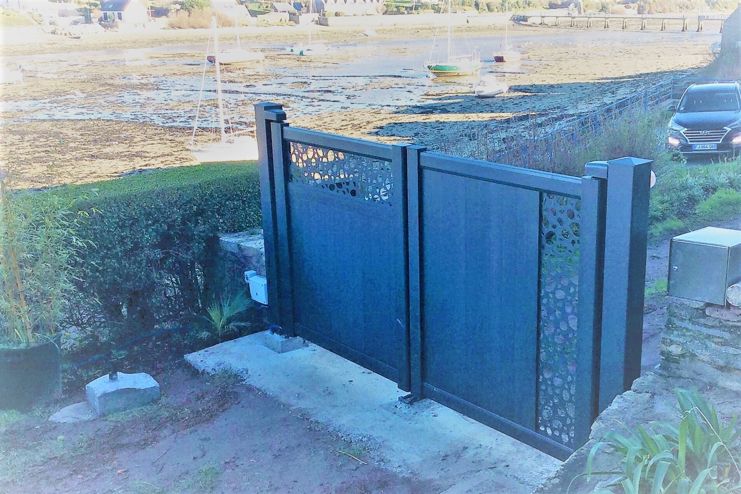 Ce portail a une particularité, il est motorisé, sans aucune motorisation apparente. Celle-ci est parfaitement cachée et intégrée dans les montants des vantaux.
