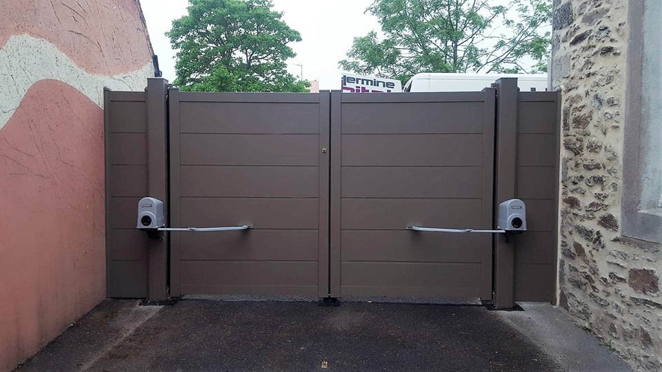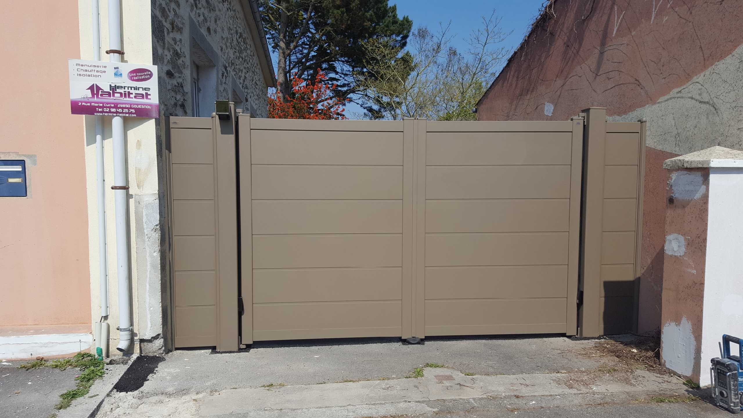 Ce portail ouvrant à la Française modèle « Canebière » de chez notre fournisseur « Maine Clôture » est en aluminium laqué RAL 7006G, est jumelé à une motorisation FAAC.