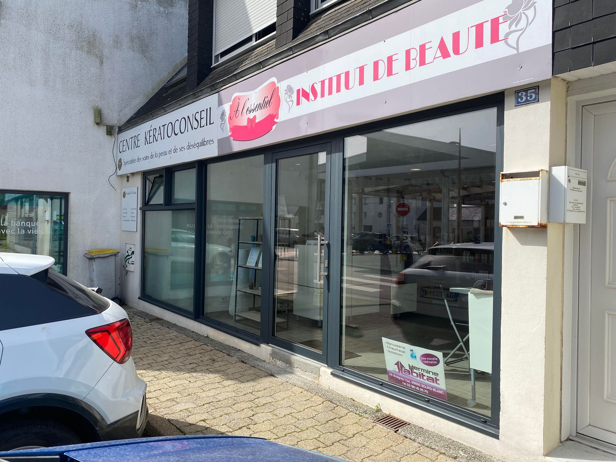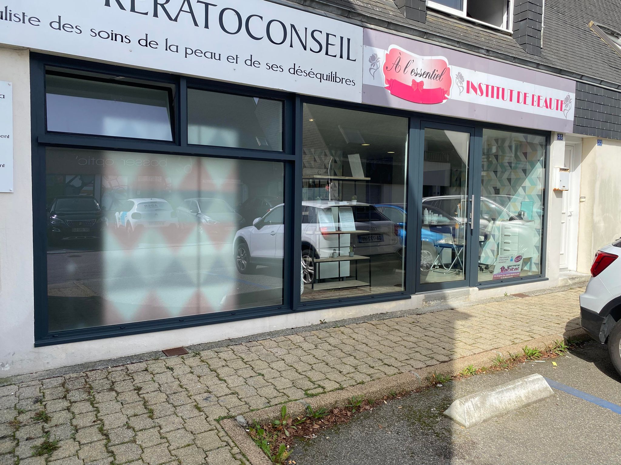Ici, dans cet institut de beauté, une porte d’entrée principale avec possibilité d’y mettre un bâton de maréchal qui est très pratique dans les commerces pour un accès en toute simplicité. De part et d’autre, des châssis fixes avec châssis à soufflet en partie haute afin de permettre une bonne aération et ventilation.